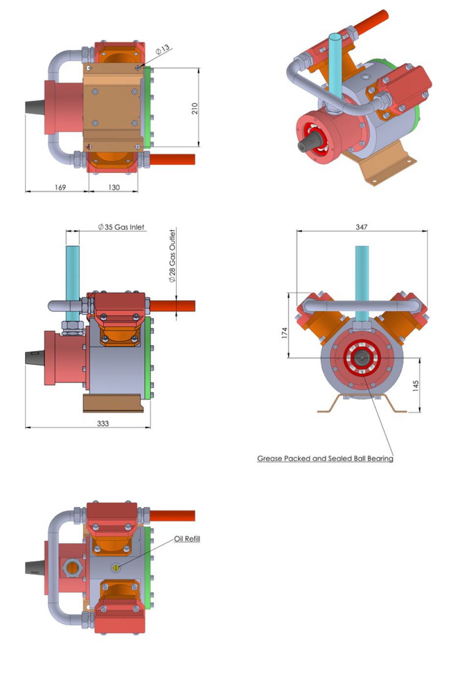 Piston and cylinder are made of cast iron. This allows precise fit of cylinder and piston which is of advantage for reducing gas leakage and enables smooth running conditions and low wear. On top of that there is a perfect valve seat for both inlet- and outlet valve.