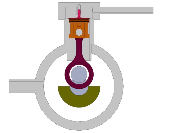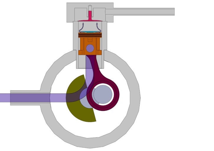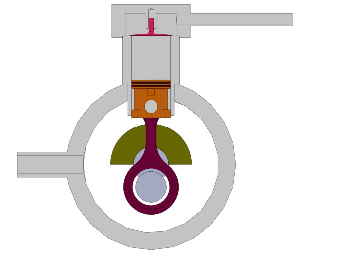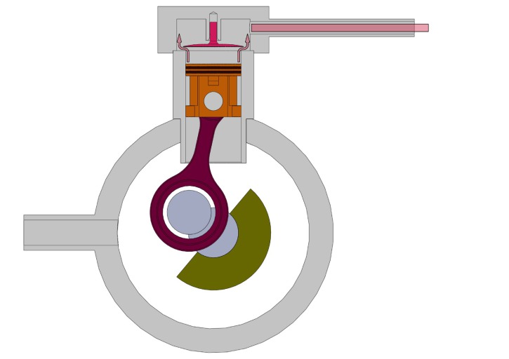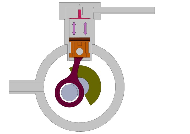 It is a reciprocating compressor. The inlet valve is incorporated in the piston and the outlet valve acts as the cylinder head. The intaken gas flows from the crankcase through the piston into the cylinder where it is compressed.
