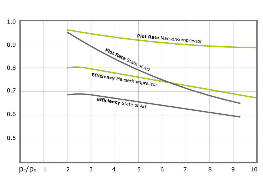 As a matter of fact the plot rate of the MaeserKompressor is high and stays comparatively even over the pressure ratio. Accordingly there is also a big improvement in the efficiency. The reason for that are the following design features.
